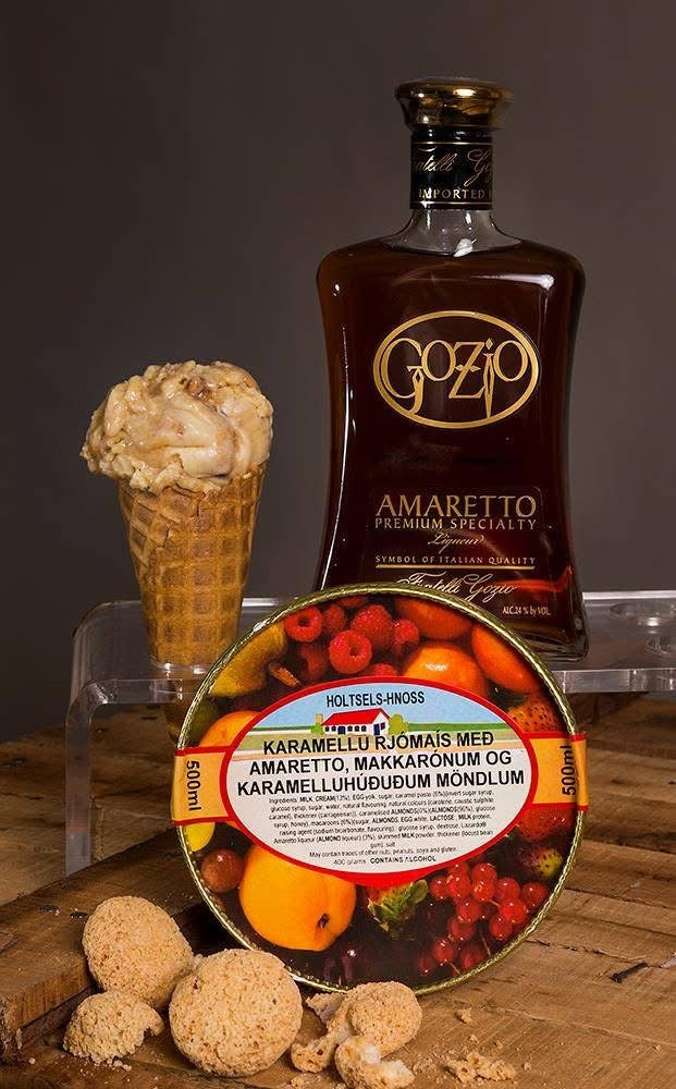 Karamelluís með Amarettó, makkarónum og karamelluhúðuðum möndlum